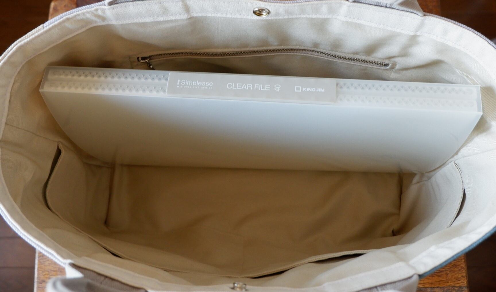 A4サイズがしっかり入るので、書類やタブレットもすっきり収納できます。 内側には便利なファスナーポケットとオープンポケットが付いており、小物の整理がスムーズです。