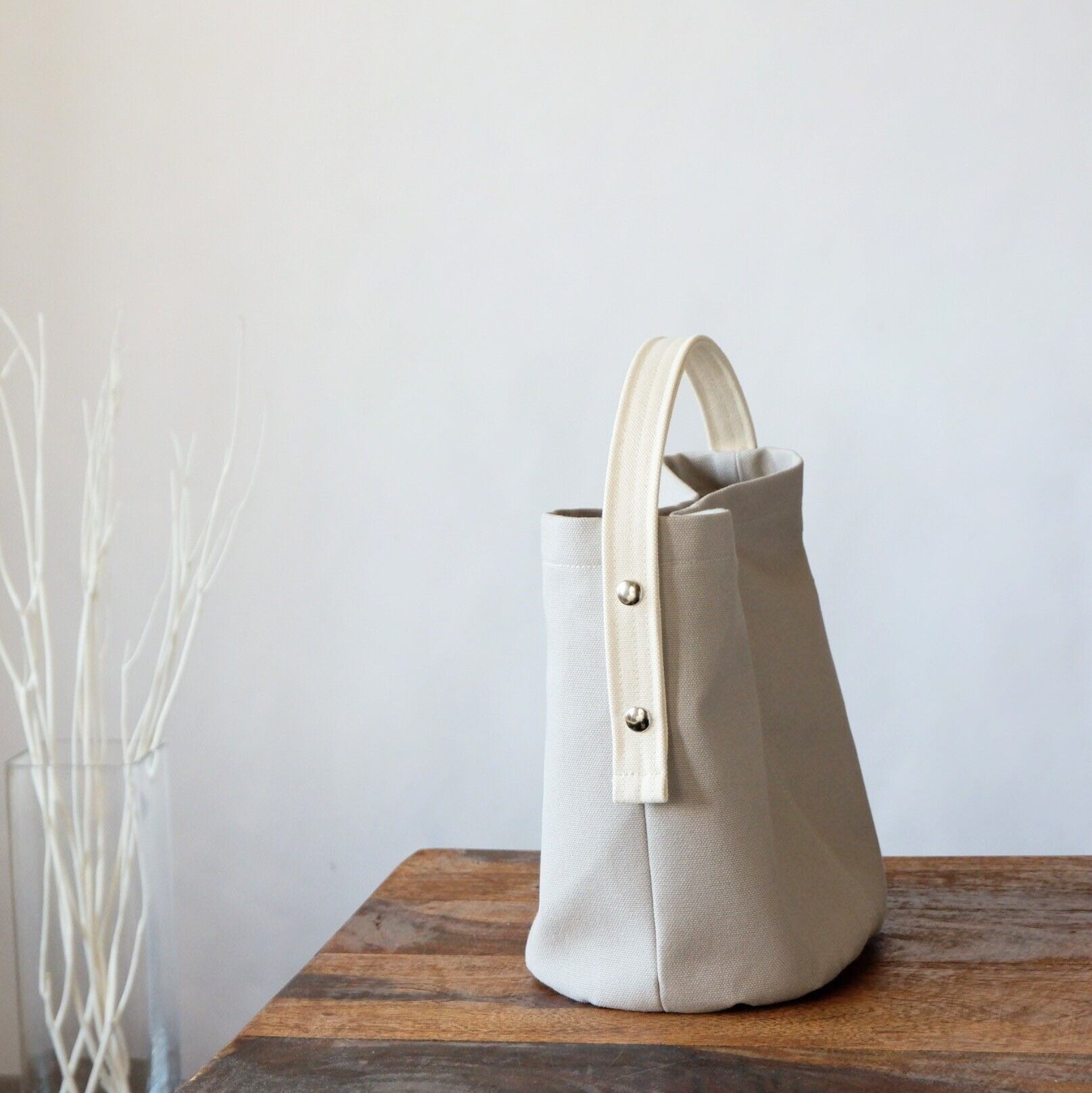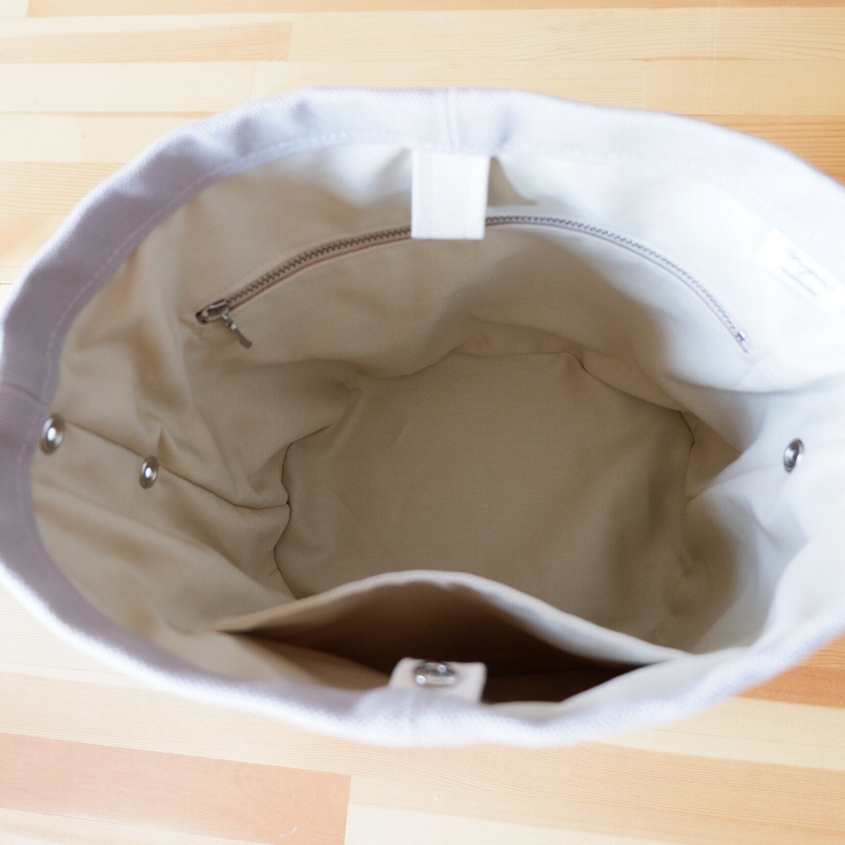 爽やかなグレーと生成りのコンビネーションが、シンプルな中にも洗練された印象を与えるトートバッグ。