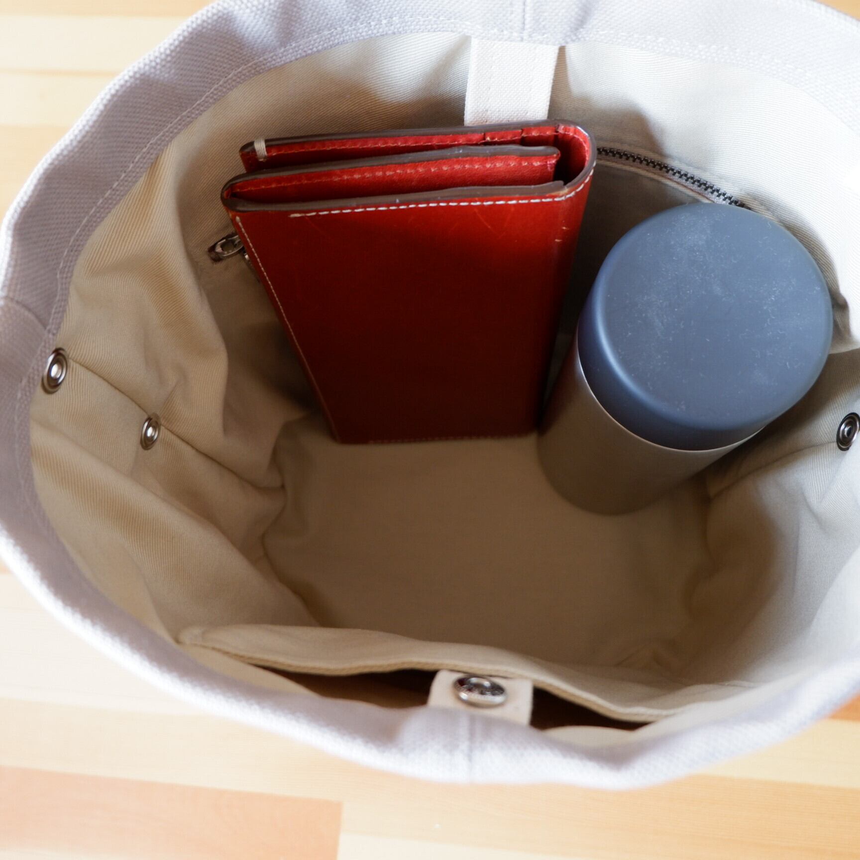 底は形崩れしないように、底板が内蔵されています。高さがあり、長財布やドリンクボトルがすっぽり入ります。