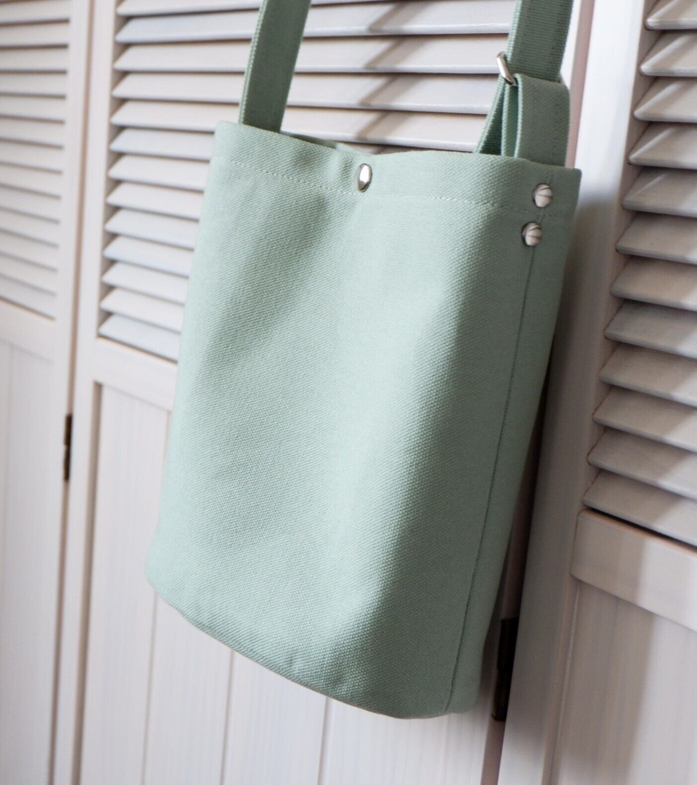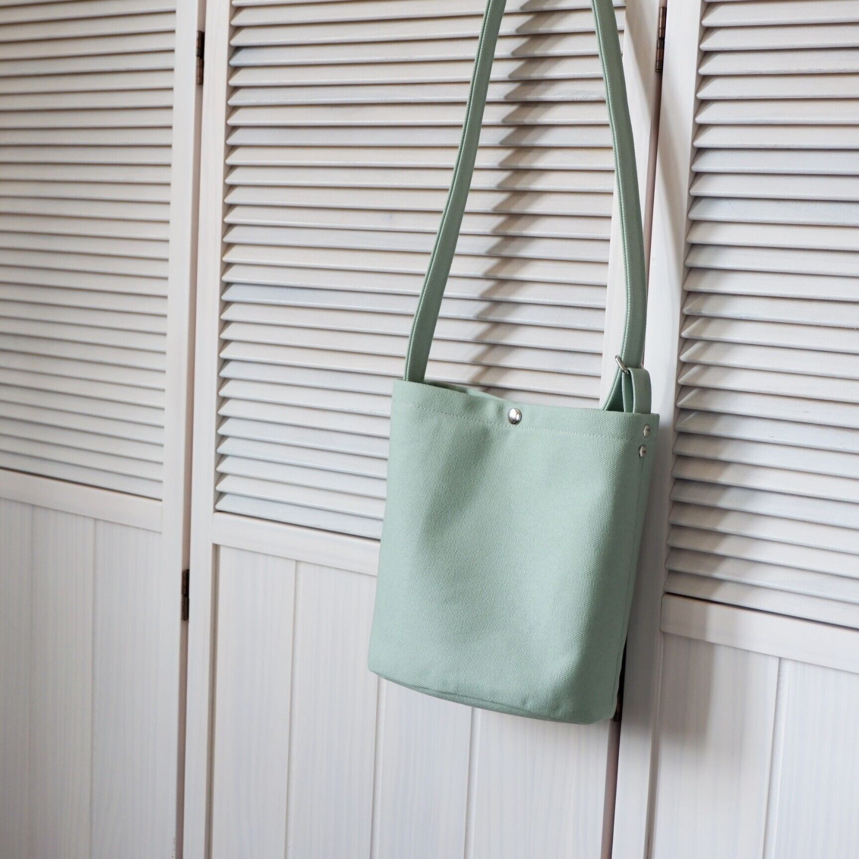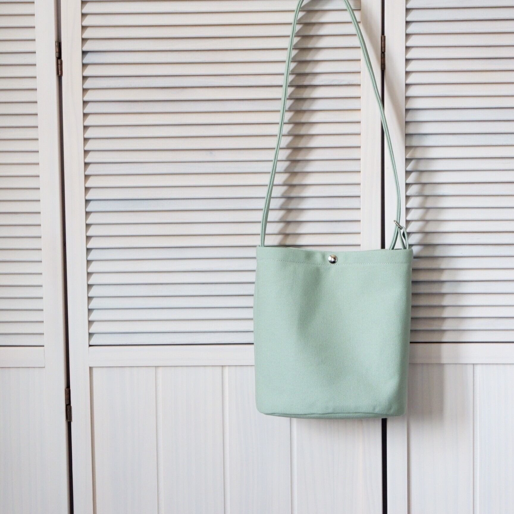 爽やかなミントグリーンが目を引く、丸底ショルダーバッグ。
