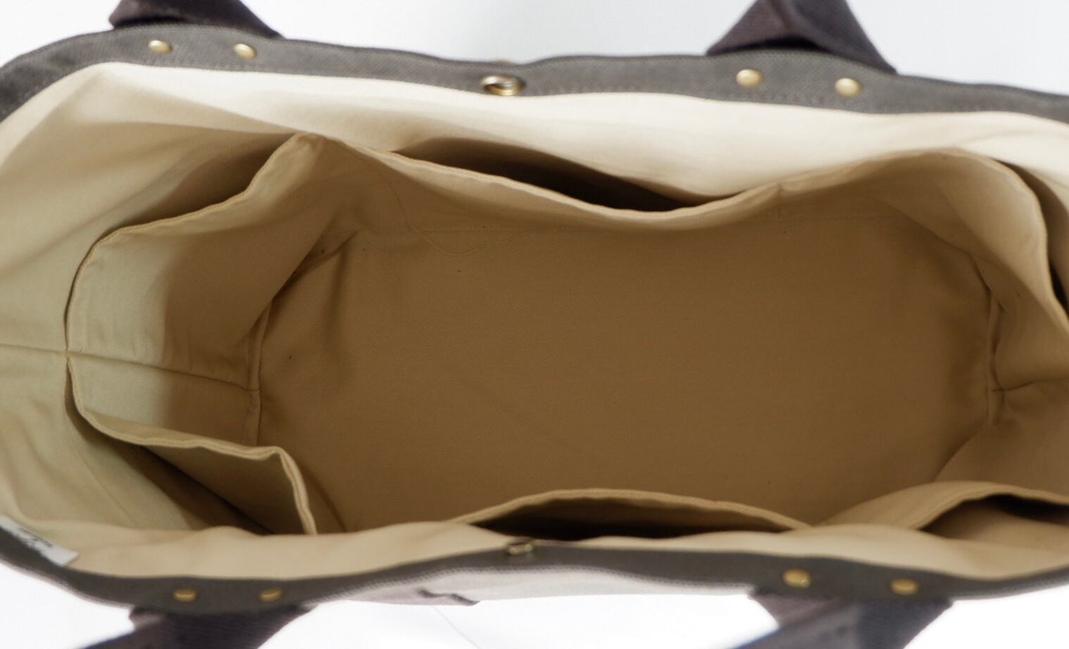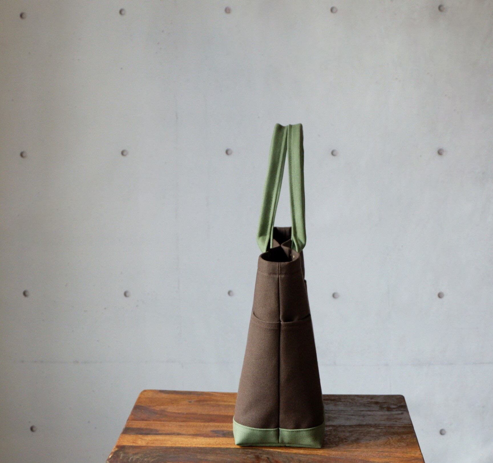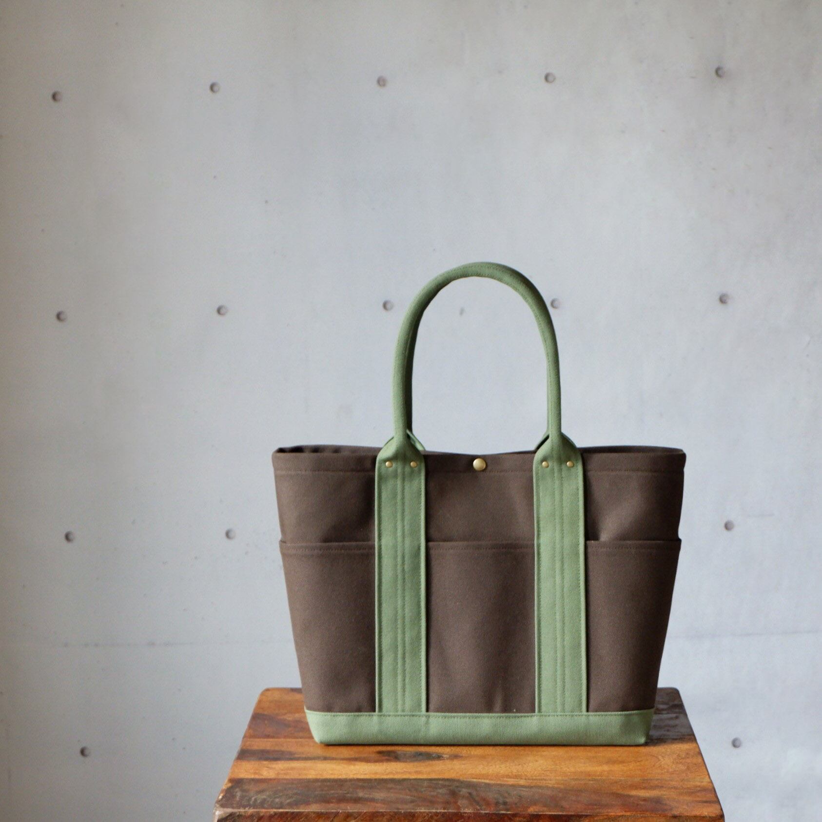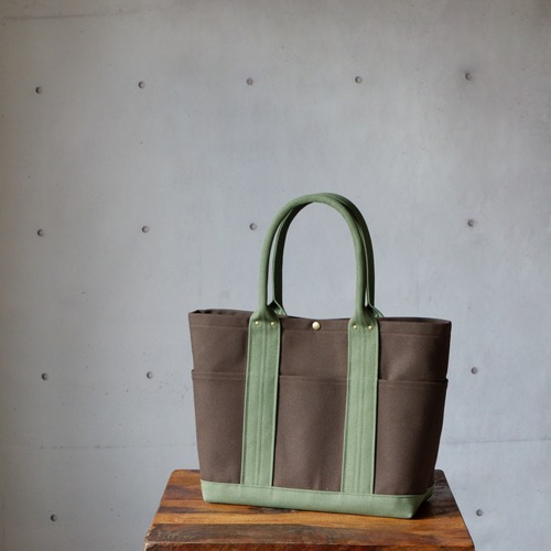 モスグリーンとダークブラウンが絶妙に組み合わさった、個性的なデザインのポケットトート。