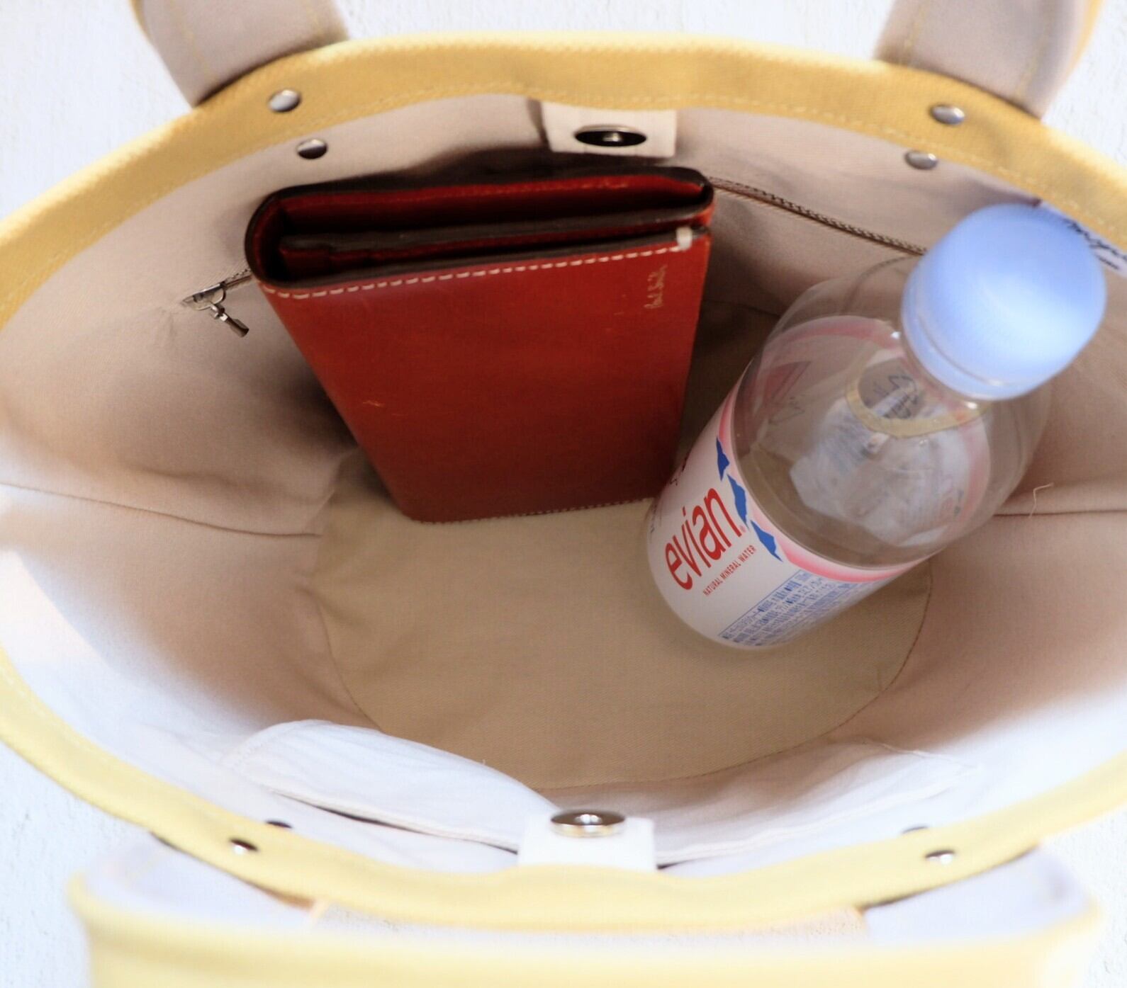 高さがあり、長財布やドリンクボトルがすっぽり入り、収納力があります。また、バッグ口ホック付きなので、バッグの中身が見えません。
