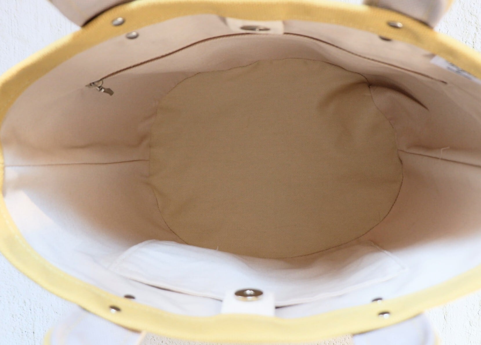 内側には、オープンポケットとファスナーポケットが一つずつ付いており、スマホや細々した物を入れておけます。