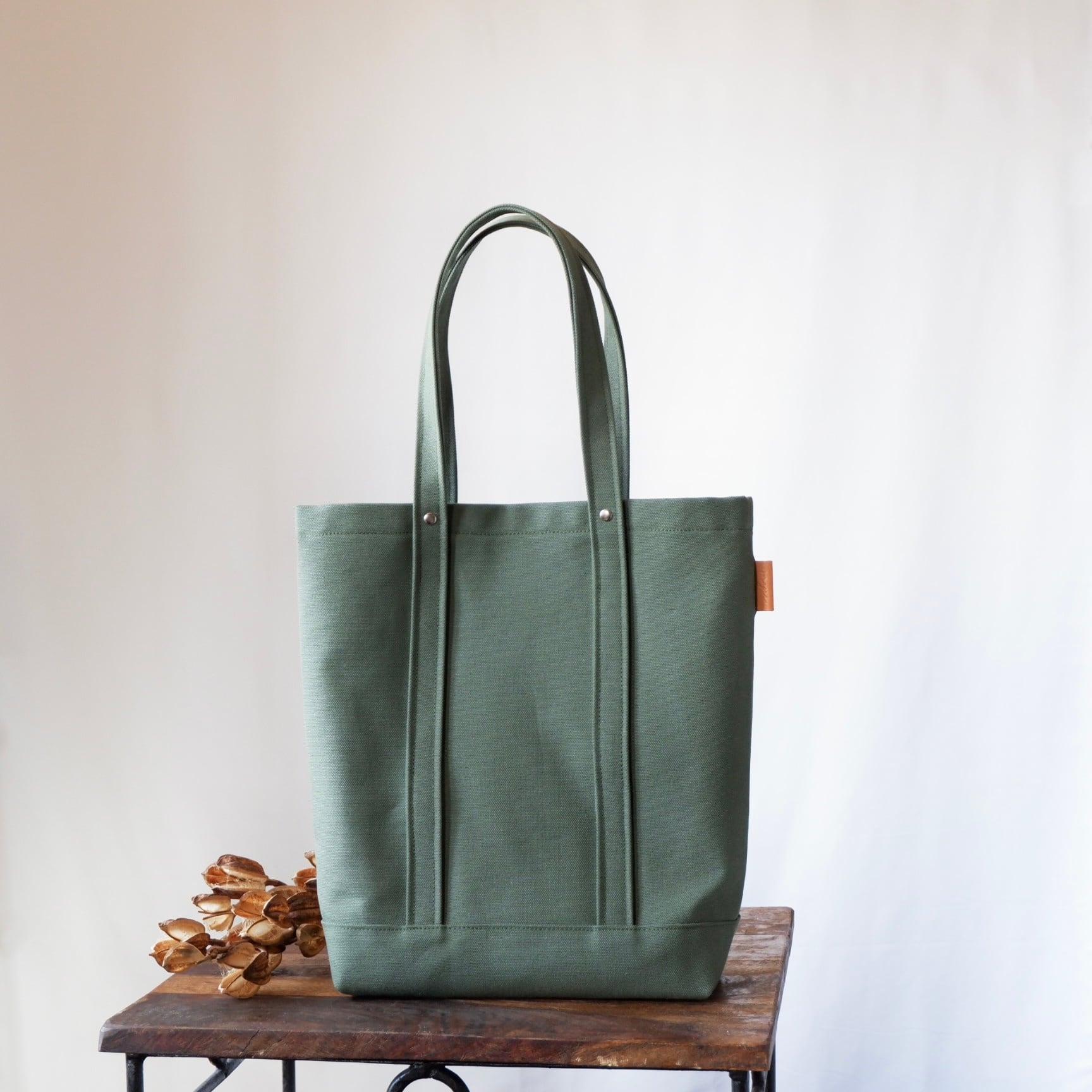 お仕事にも、カジュアルにも合わせやすい、モスグリーンの縦型A4トート。